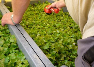By grading, we cut back the grafts in turn into two buds. In the digitally adjusted temperature paraffinizer, a new protective layer is prepared in the melted paraffin. The length of the roots is also cut back uniformly by approx. 15-20 cm long.